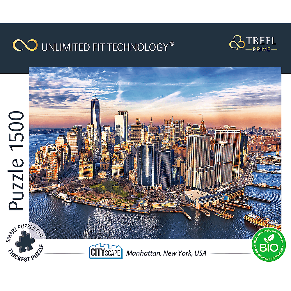 Пазли - (1500 елм.) - Безмежна колекція: "Манхеттен, Нью-Йорк, США" Головоломки з серії Trefl Prime Unlimited Fit Technology, що складається з 1500 елементів, присвячені справжнім любителям головоломки. Головоломка зображує місто Манхеттен у Нью -Йорку. Після прокладки буде створено зображення розміром 850x580 мм. Головоломки були виготовлені з високоякісних матеріалів, використовуючи найгустіший картон, унікальні форми та спеціальний метод різання. Завдяки цьому ми можемо створити індивідуальний колаж і легко перемістити всю головоломку. Крім того, окремі елементи продукції UFT виготовлені з екологічних матеріалів. Сумка жолоба та наклейки на коробці були виготовлені з біологічно розкладаної фольги. Продукти не загорнуті в теплову фольгу.