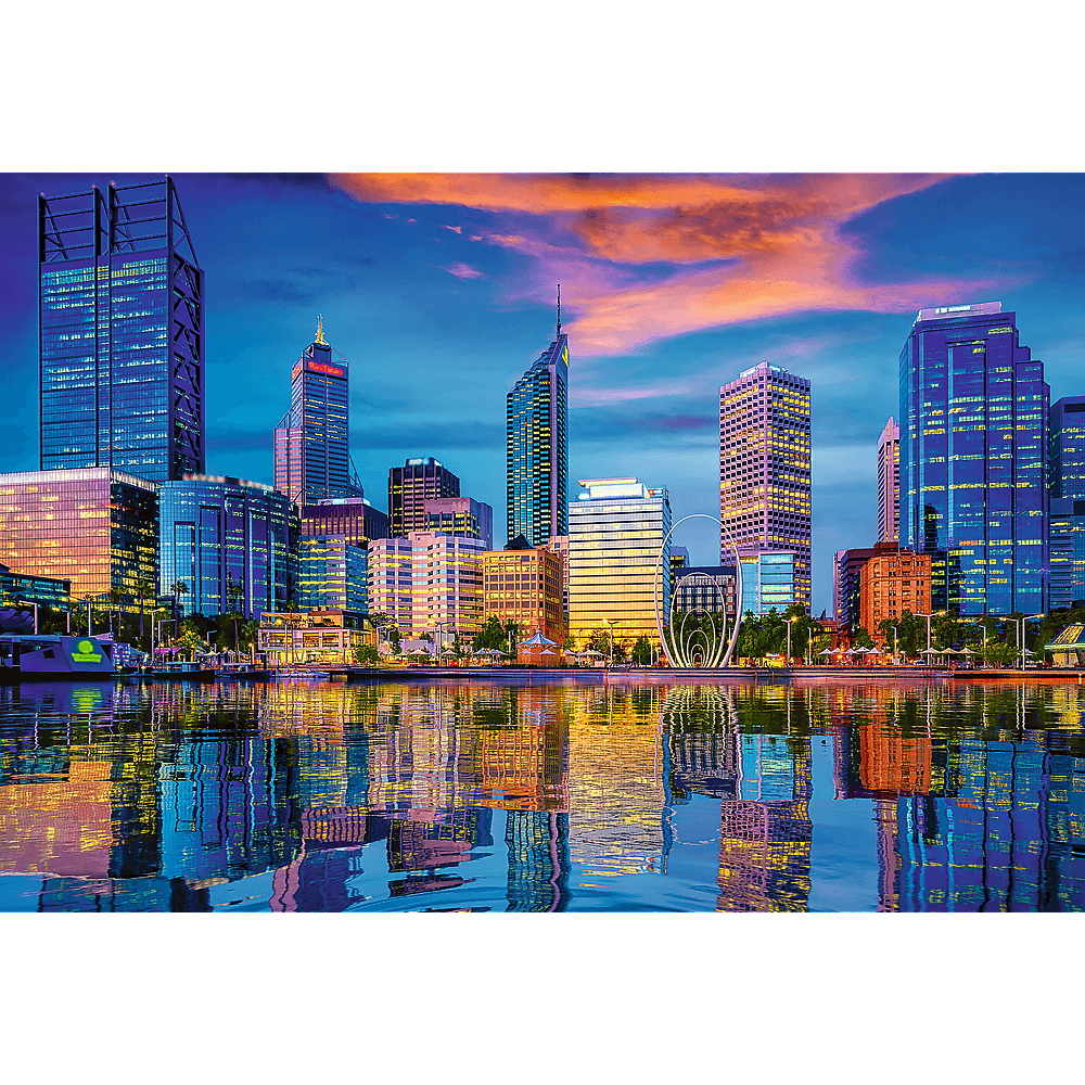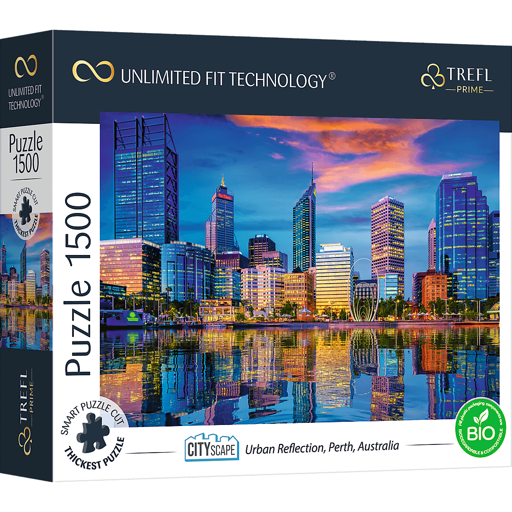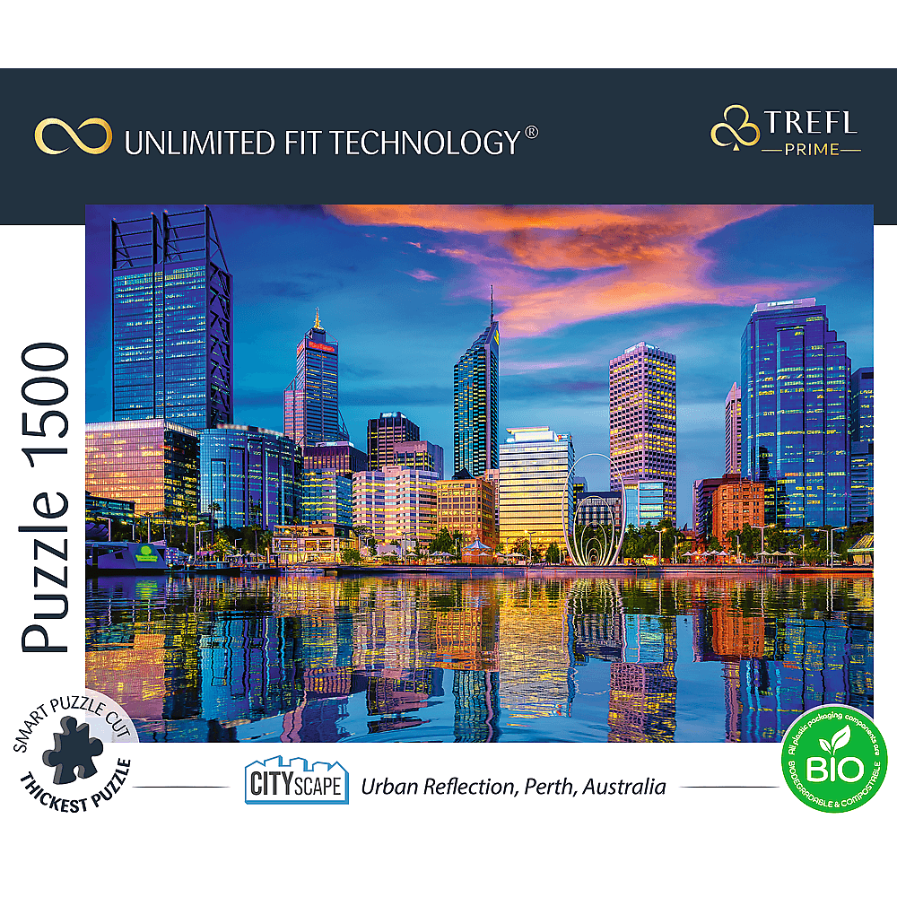 Пазли - (1500 елм.) - Безмежна колекція: "Вогні міста, Перт, Австралія" Головоломки з серії Trefl Prime Unlimited Fit Technology, що складається з 1500 елементів, присвячені справжнім любителям головоломки. Головоломки зображують барвисті вогні міста. Після прокладки буде створено зображення розміром 850x580 мм. Головоломки були виготовлені з високоякісних матеріалів, використовуючи найгустіший картон, унікальні форми та спеціальний метод різання. Завдяки цьому ми можемо створити індивідуальний колаж і легко перемістити всю головоломку. Крім того, окремі елементи продукції UFT виготовлені з екологічних матеріалів. Сумка жолоба та наклейки на коробці були виготовлені з біологічно розкладаної фольги. Продукти не загорнуті в теплову фольгу.