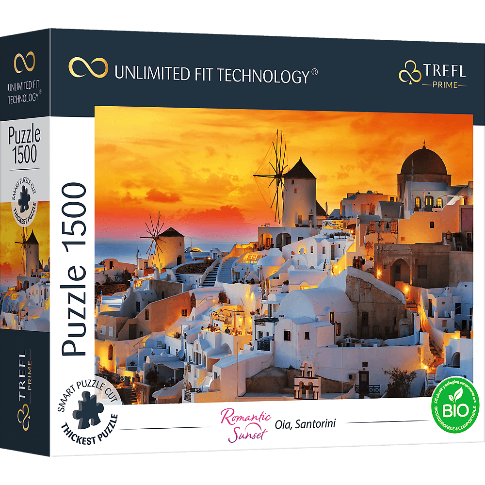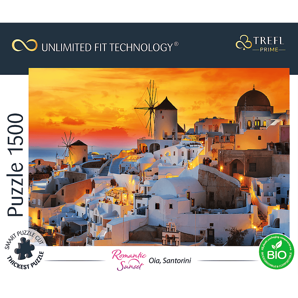 Пазли - (1500 елм.) - Безмежна колекція: "Санторіні" Головоломки з серії Trefl Prime Unlimited Fit Technology, що складається з 1500 елементів, присвячені справжнім любителям головоломки. Головоломка зображує місто OIA на острові Санторіні. Після прокладки буде створено зображення розміром 850x580 мм. Головоломки були виготовлені з високоякісних матеріалів, використовуючи найгустіший картон, унікальні форми та спеціальний метод різання. Завдяки цьому ми можемо створити індивідуальний колаж і легко перемістити всю головоломку. Крім того, окремі елементи продукції UFT виготовлені з екологічних матеріалів. Сумка жолоба та наклейки на коробці були виготовлені з біологічно розкладаної фольги. Продукти не загорнуті в теплову фольгу.
