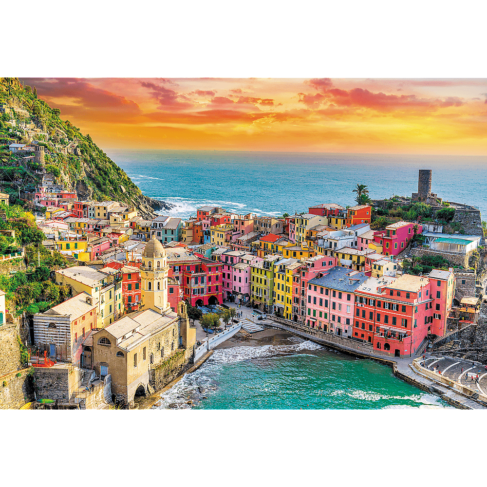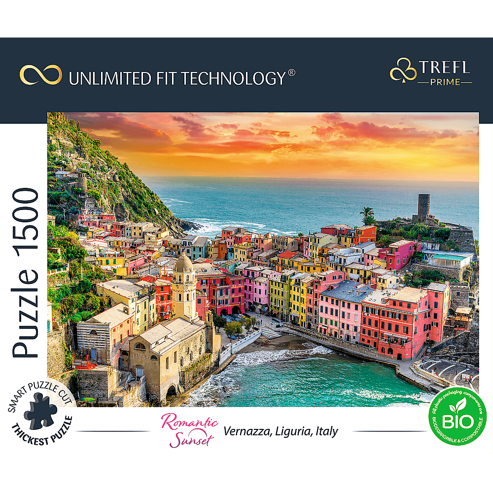 Пазли - (1500 елм.) - Безмежна колекція: "Вернацца, Лігурія, Італія" Головоломки з серії Trefl Prime Unlimited Fit Technology, що складається з 1500 елементів, присвячені справжнім любителям головоломки. Головоломка показує вид італійського містечка Вернацца в Лігурії. Після прокладки буде створено зображення розміром 850x580 мм. Головоломки були виготовлені з високоякісних матеріалів, використовуючи найгустіший картон, унікальні форми та спеціальний метод різання. Завдяки цьому ми можемо створити індивідуальний колаж і легко перемістити всю головоломку. Крім того, окремі елементи продукції UFT виготовлені з екологічних матеріалів. Сумка жолоба та наклейки на коробці були виготовлені з біологічно розкладаної фольги. Продукти не загорнуті в теплову фольгу.