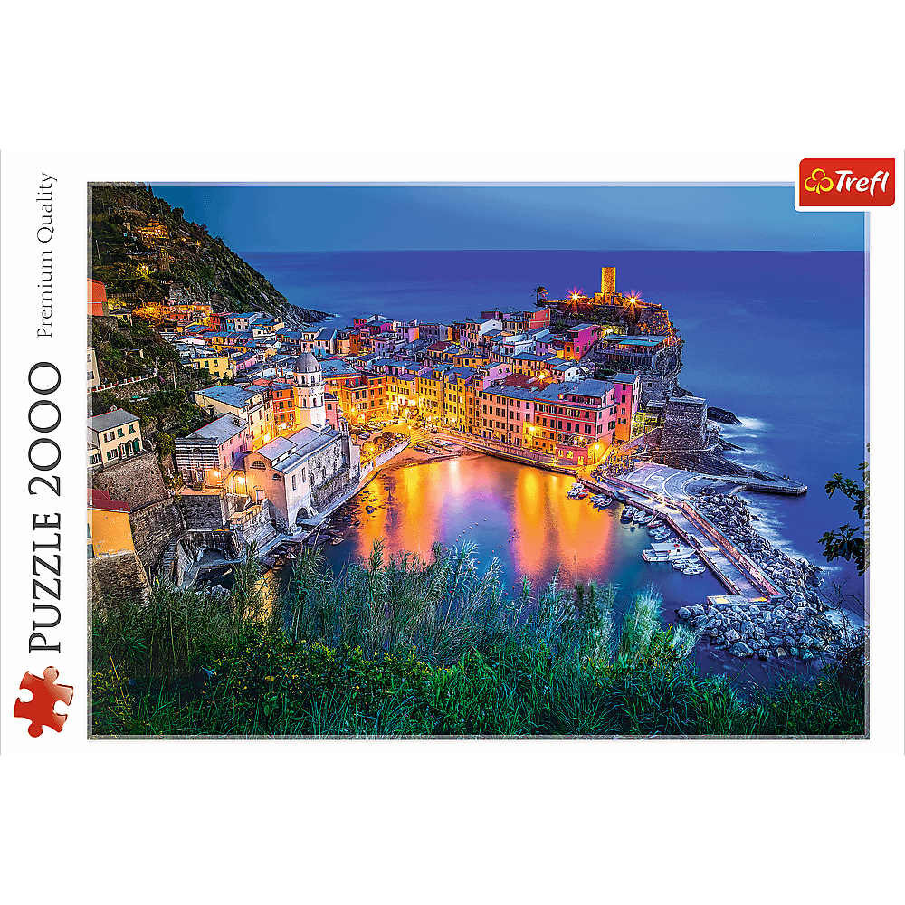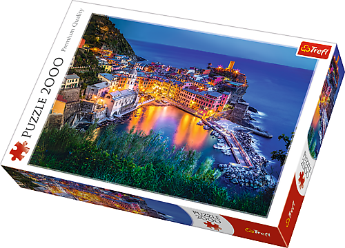 Пазли - (2000 елм.) - "Вернацца в сутінках" Пазл 2000 деталей з видом на живописне італійське місто Вернацца. Після розтановки буде створена картинка розміром 96х68 см. Висока якість, насичений колір і безпечне складання забезпечується світловідбиваючим папером, покритим екологічними харчовими фарбами.