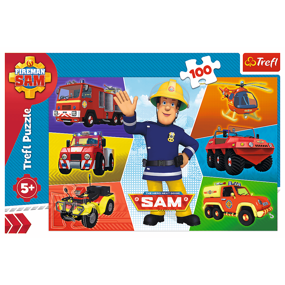 Пазли - (100 елм.) - "Транспорт пожежника Сема" Пазли, що складаються зі 100 елементів, призначені для всіх шанувальників і любителів мультфільму "Пожежник Сем". Після складання пазлу буде створена картинка розміром 410x275 мм.Виріб виготовлено з якісних матеріалів з використанням спеціального каландрового світловідбиваючого паперу, який полегшує складання. Виріб вироблено в Польщі, для виробництва використовувалися екологічні матеріали.