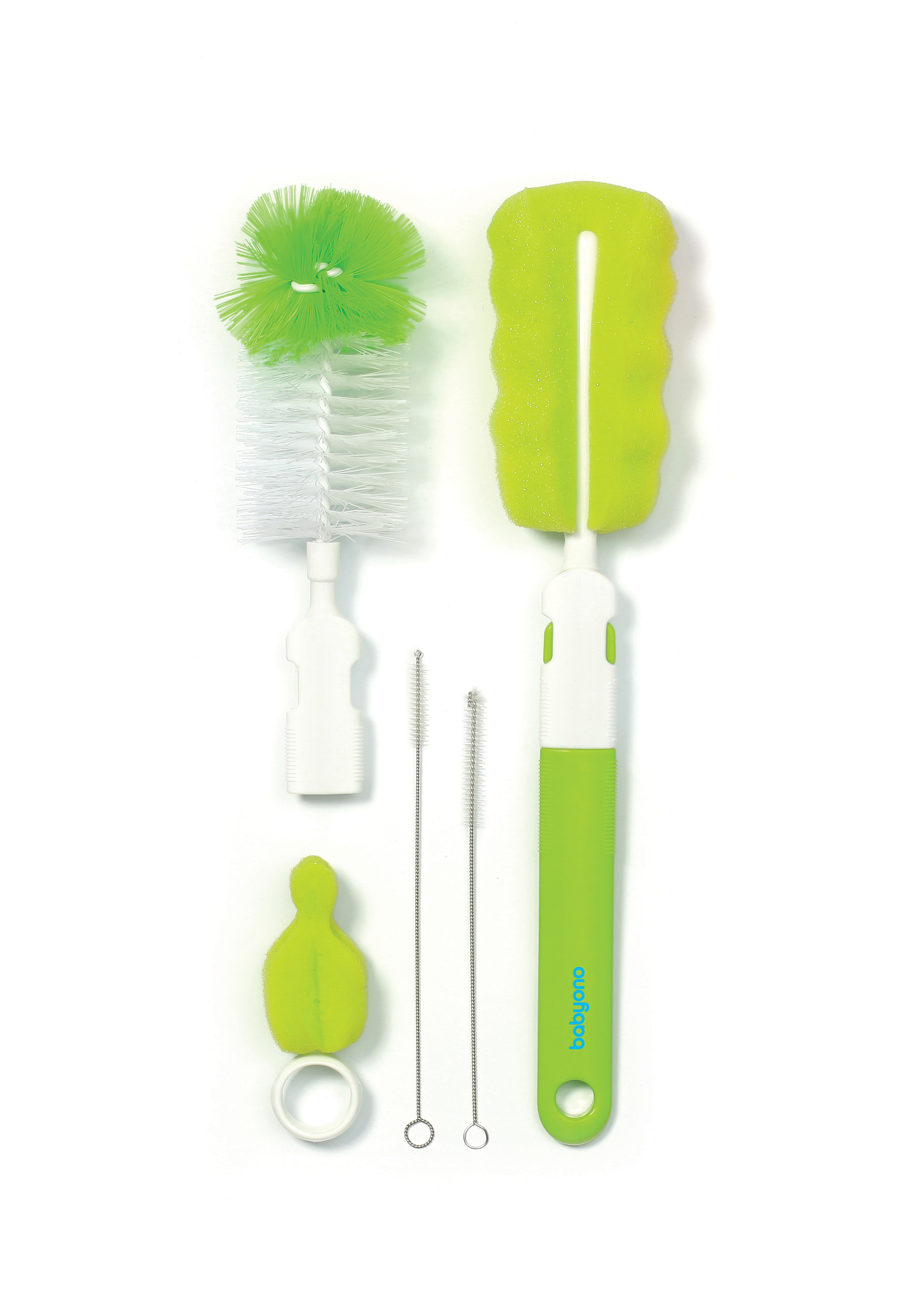 Bottle and Teat Brush Set BOTTLE AND TEAT BRUSHES WITH EXCHANGEABLE GREEN HANDLE A SET of bottle and teat brushes helps in thorough cleaning of baby feeding bottles and teats. The set is equipped with two replaceable tips for bottle cleaning, one with a soft bristle brush, and the other with a flexible sponge. The tips may be exchanged freely. The set additionally includes a sponge for teat cleaning. The brush handle features an aperture to facilitate hanging the brush to dry before next use. The brushes reach the hardly accessible places, and the comfortable handles ensure secure grip. The brushes are made from durable and safe, BPA free materials. FEATURES: