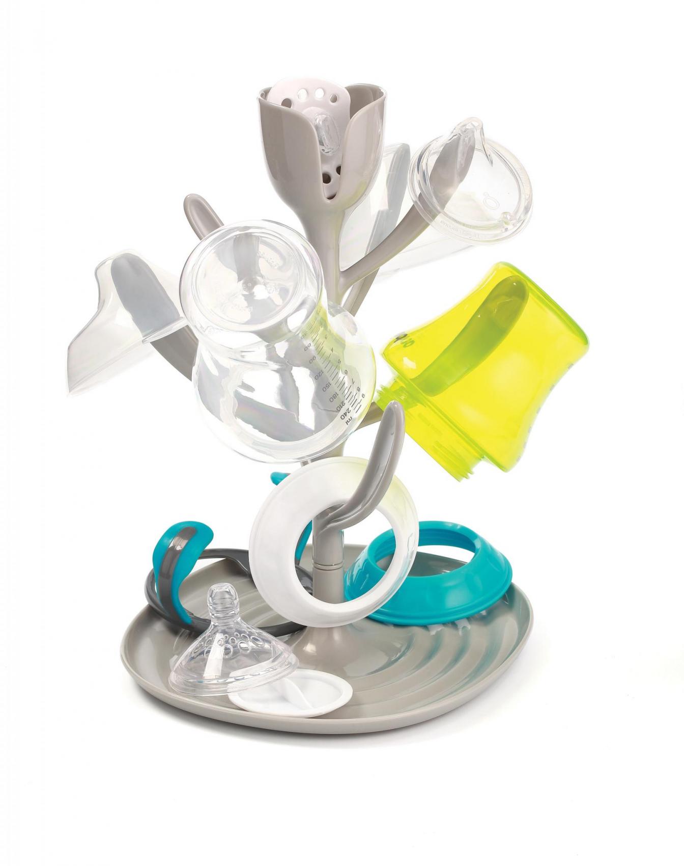 TULIP bottle drying rack A universal bottle and teat drying rack is perfect for use both at home and in travel. It is functional, suitable for all bottle types, easy to fold and clean. It has been designed to easily collect water, with no need to place it in the sink. An additional advantage is small size and original shape. PROPERTIES: