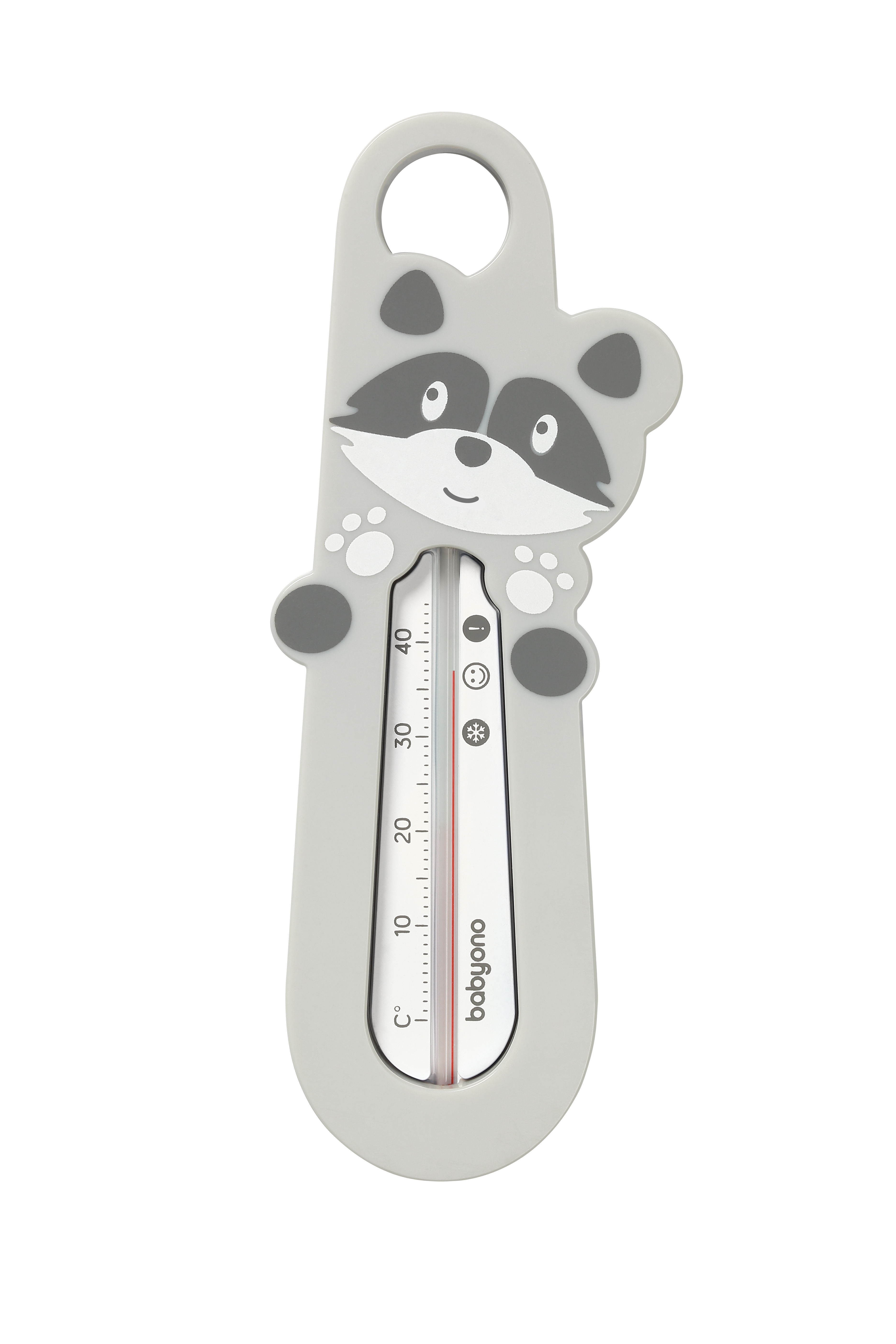 Racoon bath thermometer The Babyono bath thermometer is very comfortable and necessary for every newborn bath. It help to get and maintain the right temperature for your child’s bath. It is complete safe, because we used paraffin embedded in a safe tube. The large and legible scale makes it easier to read the temperature altitude. Thanks to the light construction, the thermometer floats on the surface of the water, allowing temperature control. The correct water temperature should be about 37 degrees Celsius and it is marked on the scale with a smiley face. SAFE AND PRACTICAL: