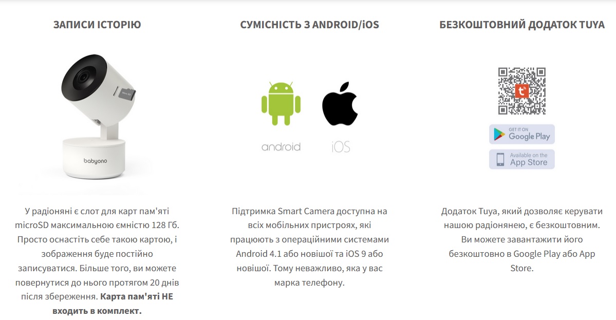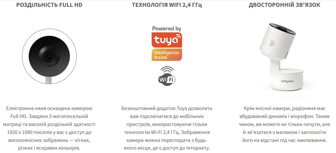Відеоняня "Camera Smart" (WI-FI) Електронна няня дозволить вам стежити за безпекою малюка. Камера передає різкі та чіткі зображення з яскравими кольорами. Високоякісний мікрофон і гучномовець дозволяють спілкуватися з дитиною прямо з її спальні. Завдяки мобільному додатку Tuya ви можете керувати радіонянею з телефону або планшета. Датчики Smart Camera фіксуватимуть усі звуки та рухи та надсилатимуть вам сповіщення. Сучасні ІЧ діоди дозволяють використовувати нічний режим, де радіоняня буде записувати чітке зображення навіть з відстані 10 метрів. Технічні дані У комплекті:
