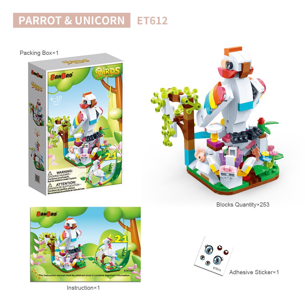 Конструктор "Пташки" (253 елм.) 2 в 1:Папуга/Єдиноріг/BanBao Яскраві набори дозволяють дітям власноруч створити улюблених птахів. Деталі легко з’єднуються, тож дитина із задоволенням збиратиме конструктор знову і знову.