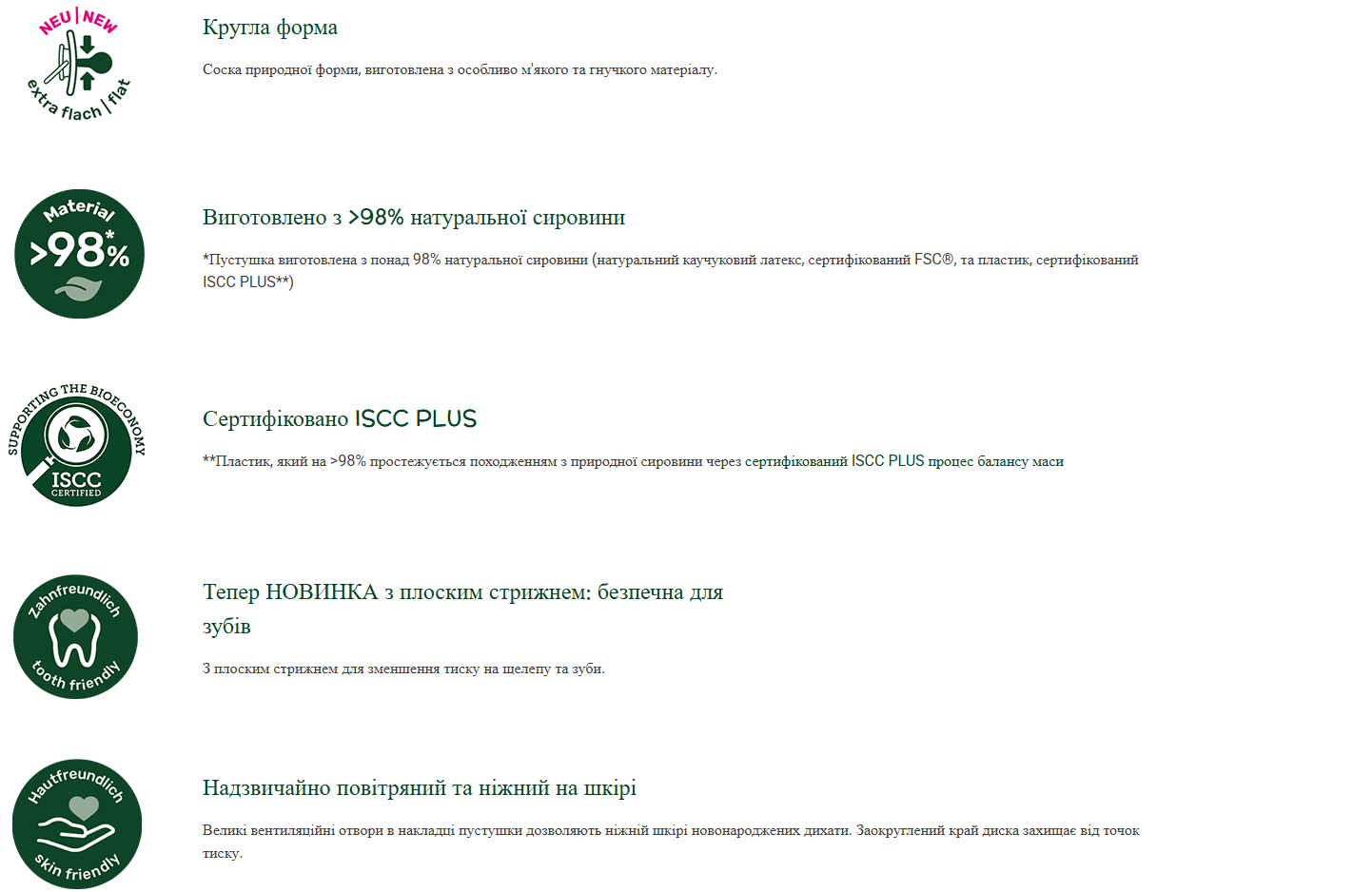 Латексні соски nip® некритичні для здоров'я?Усі наші соски nip®, виготовлені з латексу (натурального продукту медового кольору з молочного соку камеді), не є критичними для здоров’я. Усі латексні соски nip® відповідають строгим законодавчим вимогам до товарів для дітей, а також нашим внутрішнім вимогам, які є ще вищими. Це перевірено внутрішніми та зовнішніми сертифікованими лабораторіями.