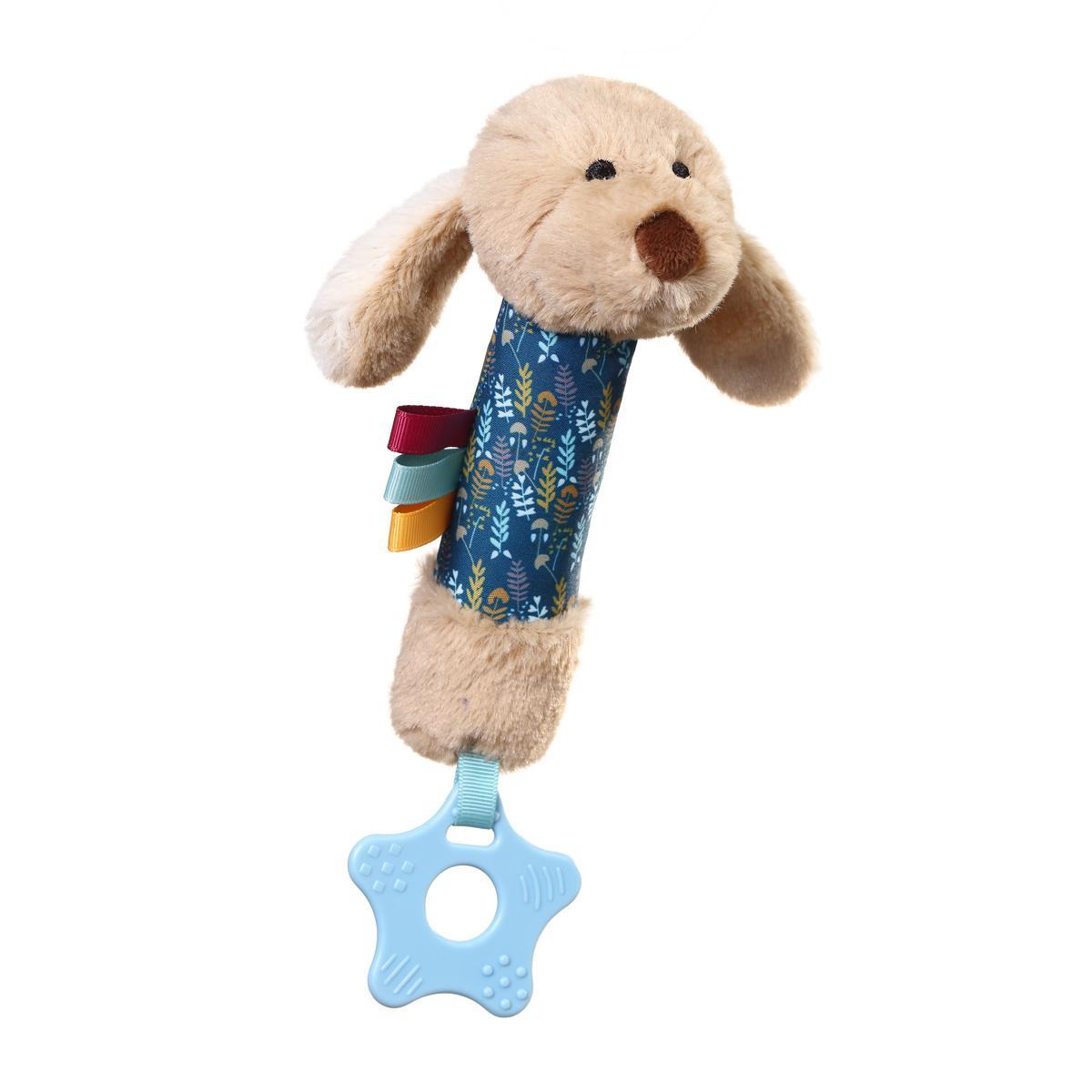 Ця чарівна собачка має м'яке хутро з тактильного матеріалу, що робить її ідеальною для обіймів і заспокоєння. Усередині собаки є пищалка, яка приховує писк. Все, що вам потрібно зробити, це ніжно обійняти або злегка натиснути, і ви почуєте щасливий писк. М'які вушка заохочують дотик, а різнокольорові бирки дозволяють тренувати маленькі ручки. Собачка також має практичний прорізувач, який допоможе вашому малюку під час складного періоду прорізування зубів.