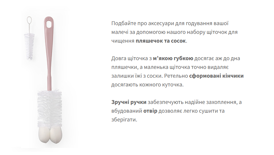 Йоршик для миття пляшок з присоскою (Сірий) Щітка на присосках 'САМОСТІЙКА' допомагає ретельно очистити як пляшечку, так і соску. Щітка має присоску, яка дозволяє прикріпити її до плоских поверхонь для легкого очищення. Щітка для пляшечок закінчується м'якою губкою, яка адаптується до форми пляшечки. Невелика щіточка заправлена в ручку для чищення пустушки. М'яка щетина щіточки та губки досягає важкодоступних місць. Щіточки виготовлені з міцних і безпечних матеріалів, які не містять бісфенол А. укомплектований присоскою для фіксації щітка оснащена м'якою губкою щіточка для чищення сосок у комплекті зручні ручки для надійного тримання щітка для чищення пляшок щіточка для чищення сосок |
