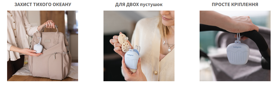 Футляр для пустушки силіконовий (блакитний)/"Babyono" Дитина плаче, ви хочете її заспокоїти, але не можете знайти її пустушку? Більше ні! З силіконовим чохлом для пустушки це більше не проблема. Улюблена пустушка вашої дитини буде чистою та готовою до використання в будь-який час.Контейнер вміщує дві пустушки стандартного розміру. Ви можете прикріпити чохол за допомогою довгої гнучкої ручки до сумки, рюкзака, коляски або ліжечка. Ви можете швидко вставляти та виймати пустушку через спеціальний отвір – навіть однією рукою. Чохол для пустушки виготовлений з м'якого силікону. Він м’який, міцний і придатний для миття в посудомийній машині. Це безпечне та гігієнічне місце для пустушки вашої малечі. Доступний до замовлення в рожевому, блакитному та бежевому кольорі. Вік дитини: від 0 міс.