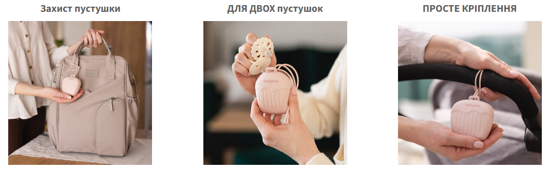Футляр для пустушки силіконовий (рожевий)/"Babyono" Дитина плаче, ви хочете її заспокоїти, але не можете знайти її пустушку? Більше ні! З силіконовим чохлом для пустушки це більше не проблема. Улюблена пустушка вашої дитини буде чистою та готовою до використання в будь-який час.Контейнер вміщує дві пустушки стандартного розміру. Ви можете прикріпити чохол за допомогою довгої гнучкої ручки до сумки, рюкзака, коляски або ліжечка. Ви можете швидко вставляти та виймати пустушку через спеціальний отвір – навіть однією рукою. Чохол для пустушки виготовлений з м'якого силікону. Він м’який, міцний і придатний для миття в посудомийній машині. Це безпечне та гігієнічне місце для пустушки вашої малечі.Доступний до замовлення в рожевому, блакитному та бежевому кольорі. Вік дитини: від 0 міс.
